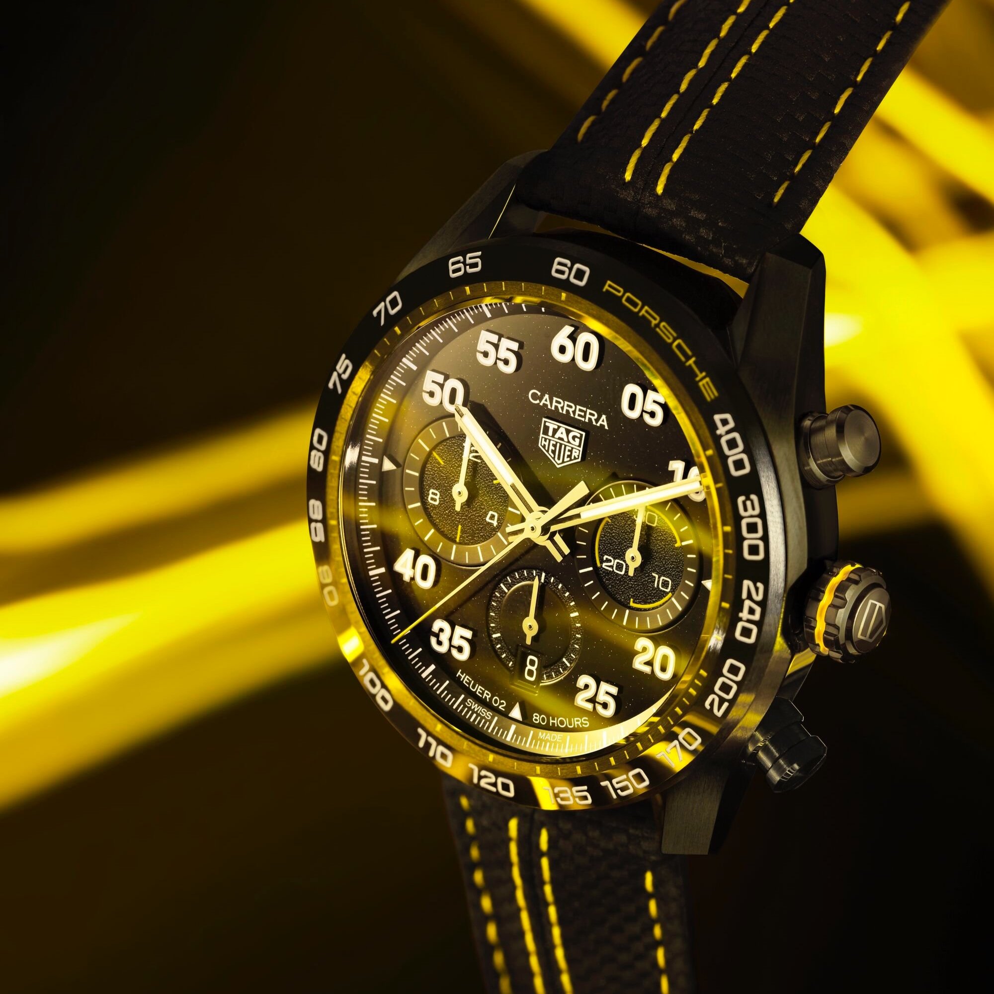 On the new model, you’ll discover a redesigned oscillating mass which pays homage to the famous Porsche steering wheel. Clearly visible through the Sapphire glass case back, it’s marked with “Porsche” and “TAG Heuer” in black and yellow finishes, bringing a perfect harmony to the design of the watch.