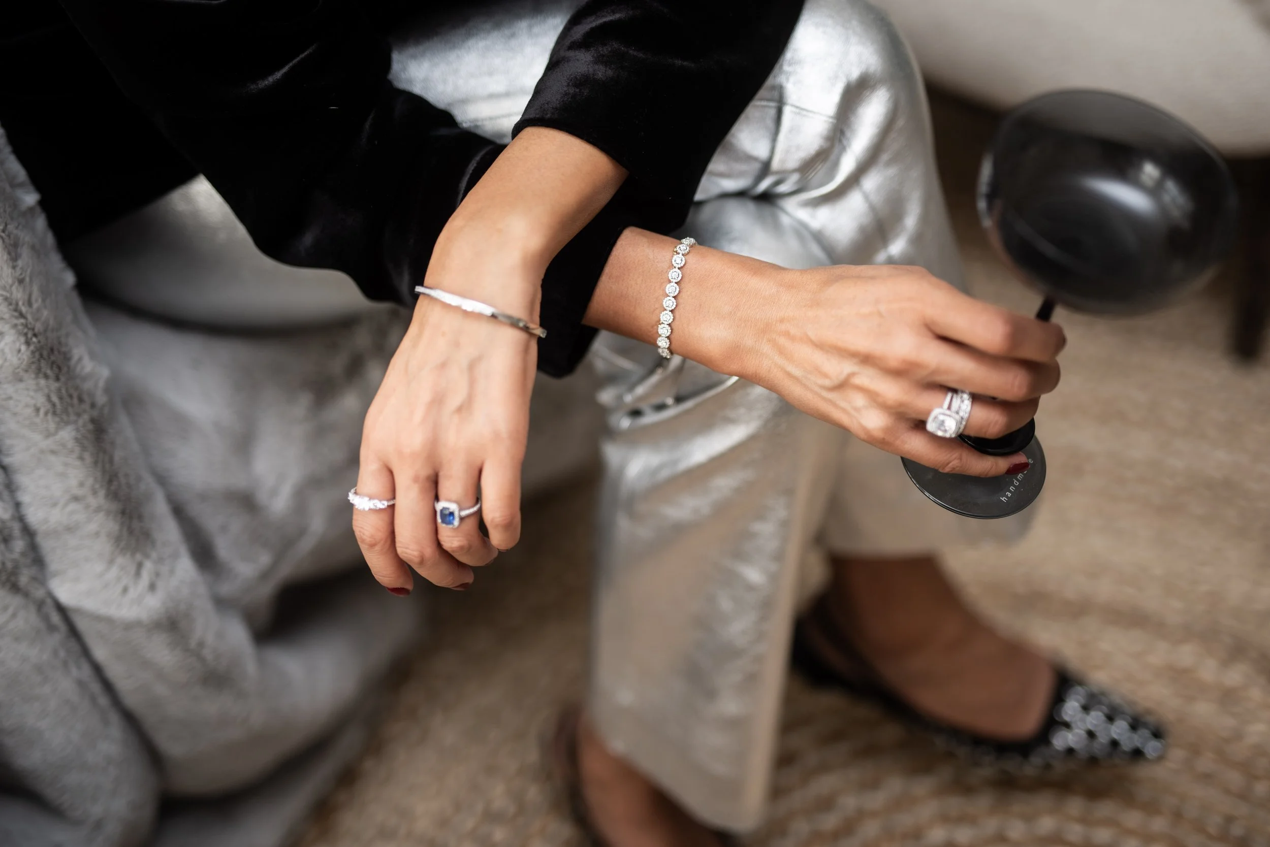 We love stacking the sparkle, and our Brand Ambassador, Debbie, styles her silver tennis bracelet with more silver jewellery and sparkling rings. Paired with a statement black blazer, making her jewellery pop even more, we’re obsessed with her party season look!